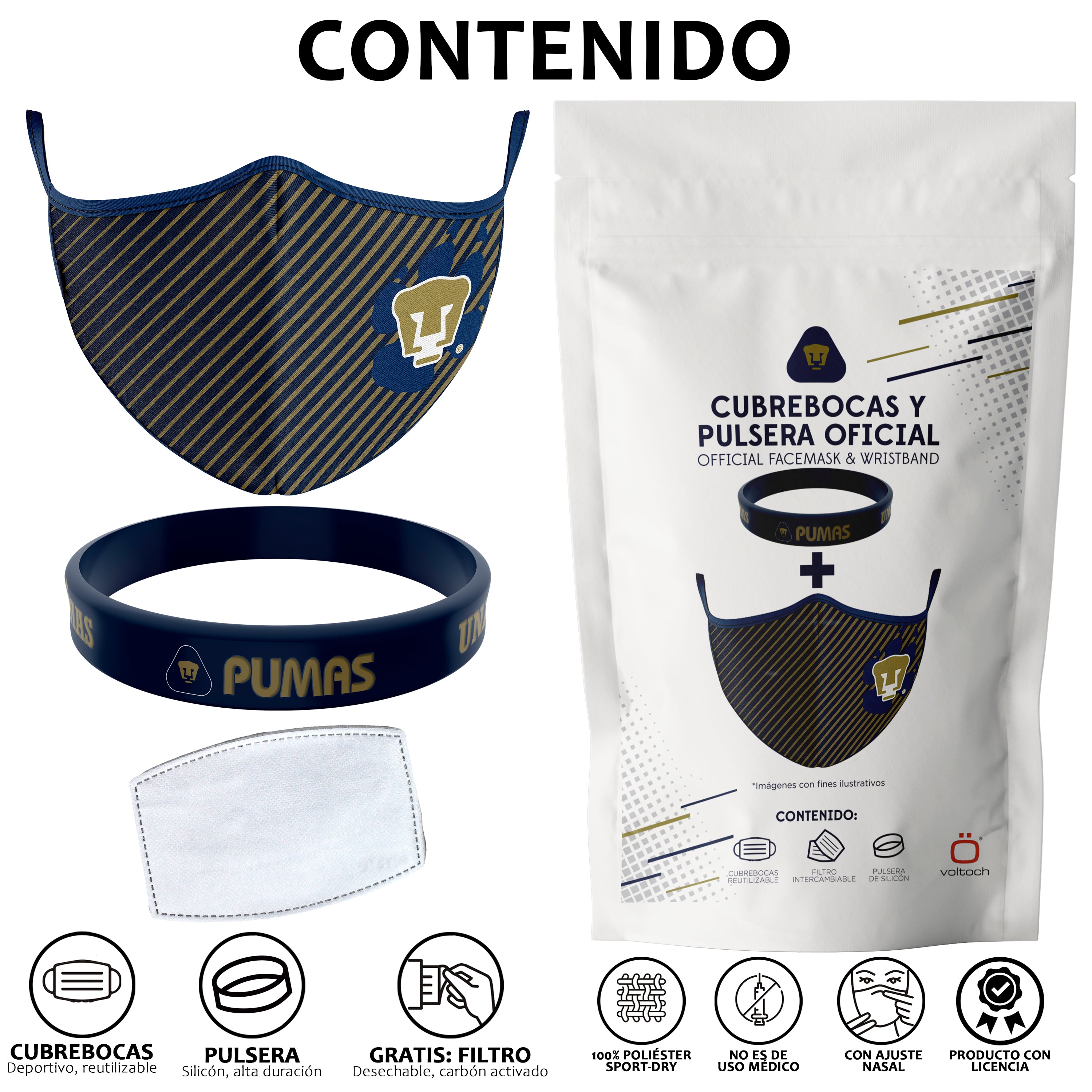 ¡Protégete y lleva los colores de Pumas todos lados! El cubrebocas está hecho de materiales de alta calidad con un diseño sólo para los Pumas de corazón. Además de ser ergonómico y de tener un diseño que garantiza el confort, el cubrebocas es completamente reutilizable y lavable.